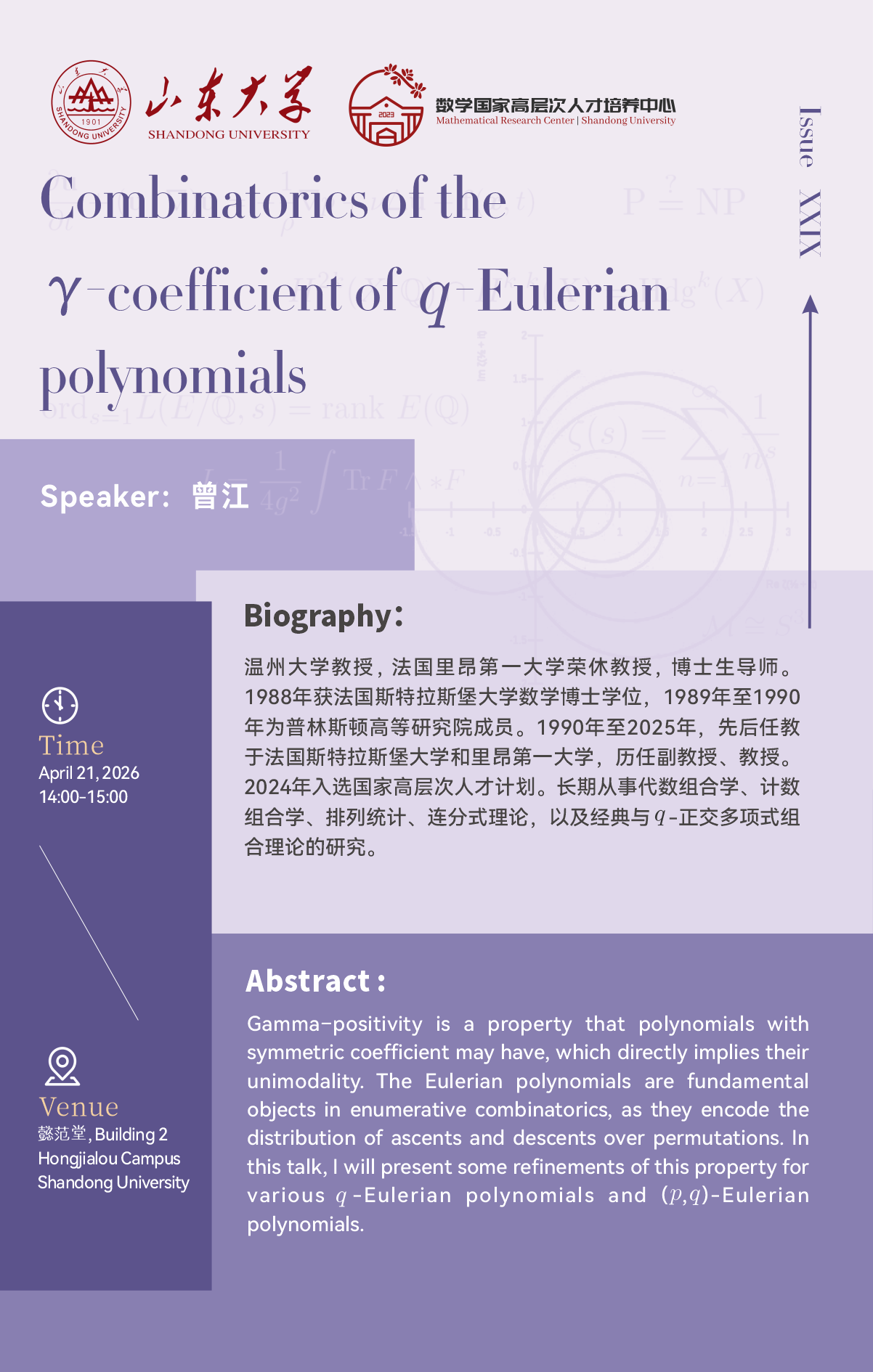 系列讲座 (Issue 29) | Combinatorics of the γ-coefffcients of q-Eulerian polynomials